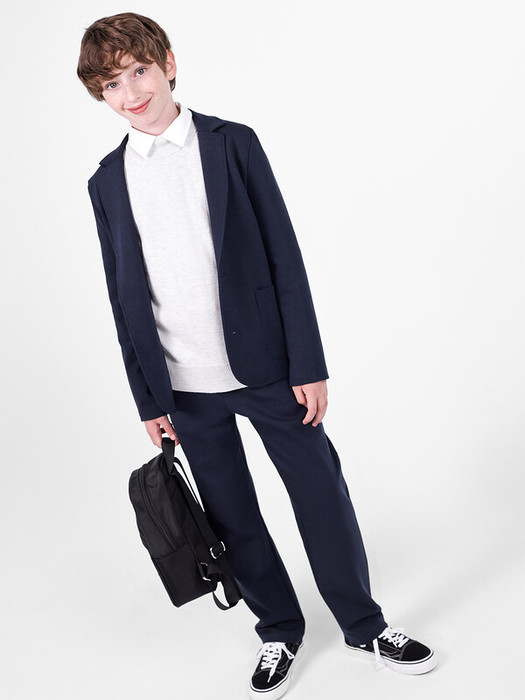 Однобортный жакет для мальчиков прямого силуэта. Без подкладки. С накладными карманами. Рукава двухшовные длинные втачные. Застежка на 2 пуговицы. Низ жакета и рукавов обработан на плоскошовной машине швом в подгибку.