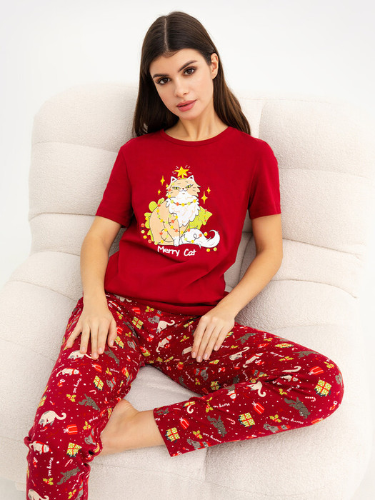 Совместные покупки Каменск-Уральский Женская одежда Пижамы, халаты — Mark FormelleКОМПЛЕКТ ЖЕНСКИЙ (ФУТБОЛКА, БРЮКИ) 592369 592369 вишневый +коты на