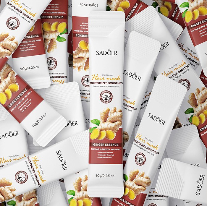 Маска для волос с имбирем Sadoer восстанавливает поврежденные волосы, глубоко питает и укрепляет их.Маска интенсивно увлажняет, повышает эластичность, придавая силу, упругость и естественный блеск. Улучшает структуру волос, сглаживая поврежденные чешуйки придает волосам исключительную гладкость без ощущения липкости улучшает мягкость и послушность волос, облегчает расчесывание, не оставляет жирности и не утяжеляет волосы., Используйте как экспресс-маску. Нанесите на влажные волосы после мытья шампунем и оставьте на 1-3 минуты. Смойте водой.Используйте как кондиционер.  После мытья шампунем нанесите на влажные волосы от корней до кончиков. Смойте водой.Используйте как интенсивный уход. Нанесите на слегка подсушенные волосы после мытья шампунем и оберните голову полотенцем, ожидайте приблизительно 15-30 минут. Смойте водой.На длинный волос требуется 2 штуки.