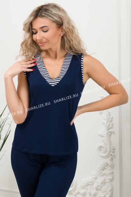 Майка из качественного вискозного полотна. Изделие в гармоничном сочетании, глубокого синего оттенка и морской полоски. V-образный вырез горловины, визуально вытягивает силуэт фигуры и лица.