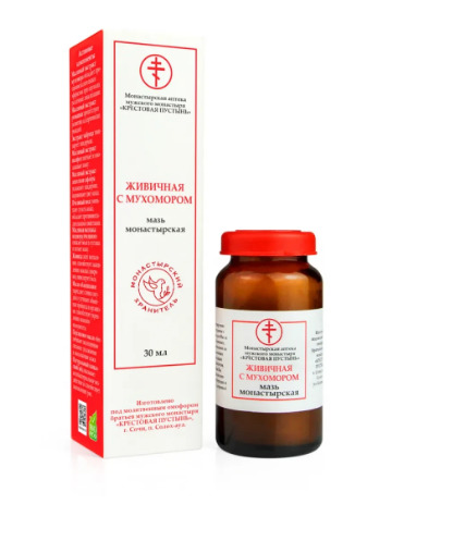 Природные компоненты, входящие в состав монастырской мази «Живичная с мухомором», издревле применялись целителями при болях от опухолей, спазмах, судорогах, радикулите, кожных заболеваниях, варикозе, подагре, бородавках, папилломах, трещинах, огрубениях кожи, нарушении целостности кожных покровов.