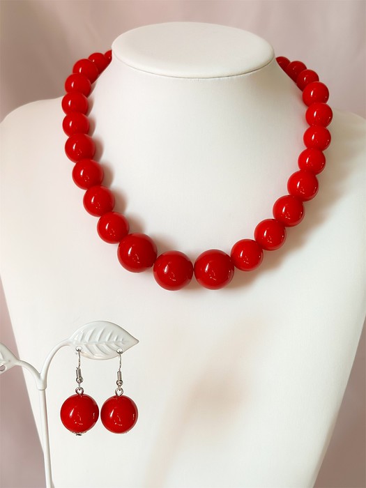 Яркий набор из коралловых бусин. В набор входят колье и серьги.