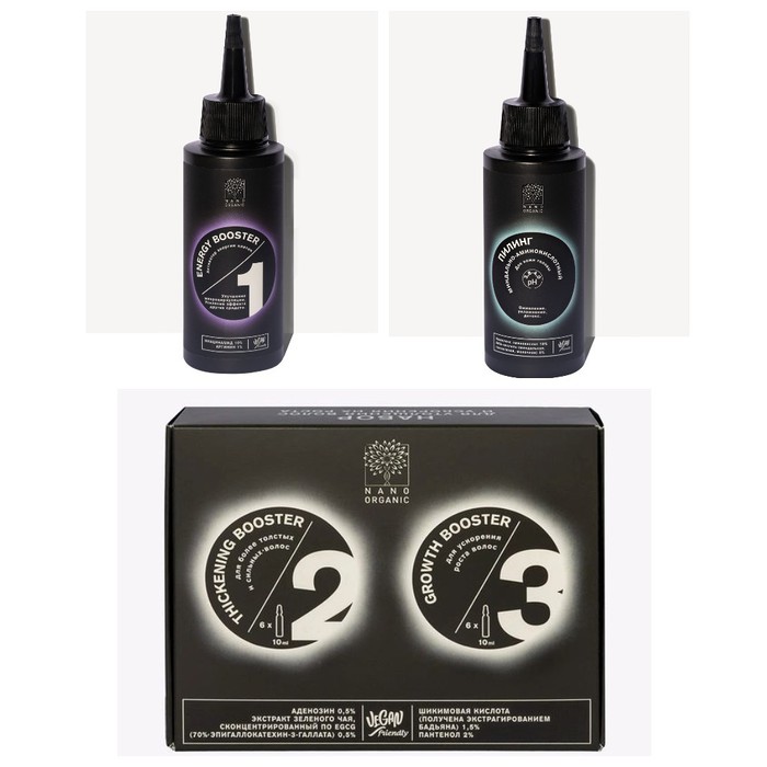 ** 1. Набор ампул для утолщения и ускорения роста волос, 12*10 мл, Nano Organic.