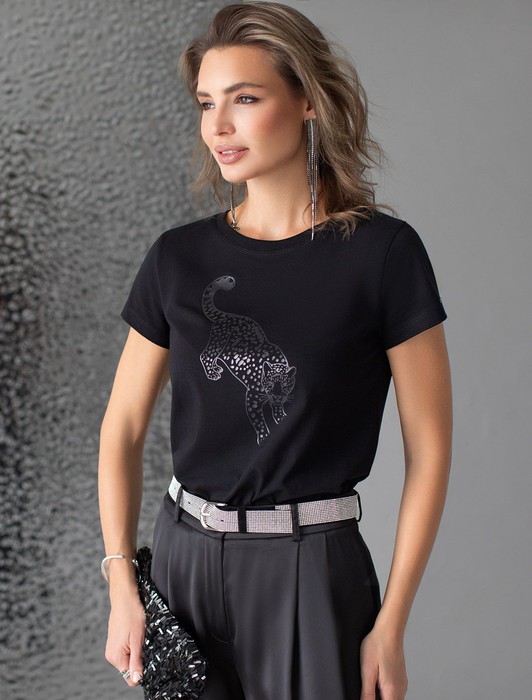 Состав: 92%Хлопок 8%ПУ Плотность: 170 Г/м2Стильная базовая футболка черного цвета с серебристым принтом устойчивыми красками выполнена из плотного хлопка с эластаном для комфортной посадки на любую фигуру. Прямая футболка классического кроя с круглым вырезом, прекрасно подходит для разных типов фигуры, в том числе и на большие размеры. Мягкость хлопка вместе с небольшой долей эластана гарантирует идеальную посадку и свободу движений. Легкая натуральная дышащая ткань премиального качества делает футболку с коротким рукавом идеальным вариантом для повседневной носки дома, на работу или офис. Однотонная футболка дополнена авторским аккуратным принтом с изображением леопарда, который придает праздничный и элегантный вид без лишней вычурности. Блестящий анималистичный принт аккуратно украшает, добавляя изысканный акцент и создавая легкий мерцающий эффект.