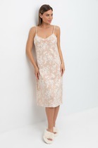 Сорочка женская из трикотажного полотна «кулирка» слегка расширенная книзу, без рукавов. Кружевные детали кокетки на полочке образуют V-ный вырез горловины. На нижней части полочки по шву притачивания кружевной кокетки заложены симметричные складки, проймы окантованы основным материалом.