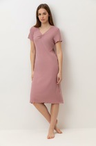 Сорочка молодежная из гладкокрашенного вискозного полотна, слегка расширенная книзу, с горловиной овальной формы, без рукавов на бретелях. Горловина и проймы окантованы основным материалом, детали бретелей выкроены из кружева, низ изделия отделан кружевом.