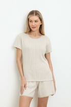 Сорочка молодежная из гладкокрашеного трикотажного вискозного полотна, на узких бретелях из окантовки, слегка расширенная книзу, с лифом «бюстье», отделанным кружевом по вырезу горловины и соединенным с основной деталью переда кружевной вставкой. Чашечки лифа присборены по нижним срезам и образуют спереди запах. Спинка - с кружевной деталью треугольной формы, соединенной с бретелями в вершине угла посредством пластмассового кольца. Для регулирования длины бретелей предусмотрены пластмассовые регуляторы. Верхний срез спинки и проймы окантованы основным материалом.
