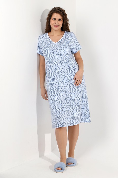 Сорочка женская из трикотажного полотна «кулирка» с набивным рисунком, слегка расширенная книзу, с короткими втачными рукавами, горловиной V-образной формы, окантованной контрастным материалом и украшенной декоративной строчкой «кроше», с атласным бантиком по центру. Рукава с притачными манжетами и кантом в шве стачивания.
