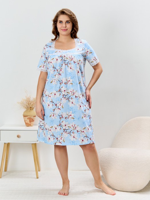 Сорочка женская из трикотажного полотна «кулирка» с набивным рисунком, свободного покроя, расширенная книзу, с короткими втачными рукавами и горловиной фигурной формы. Полочка – с притачной кокеткой V-образной формы, состоящей из двухч астей. Нижняя, основная деталь полочки присборена по шву стачивания с кокеткой. Низ рукавов, горловина и кокетка отделаны кружевом. В центре кокетки – два декоративных бантика из узкой атласной ленты