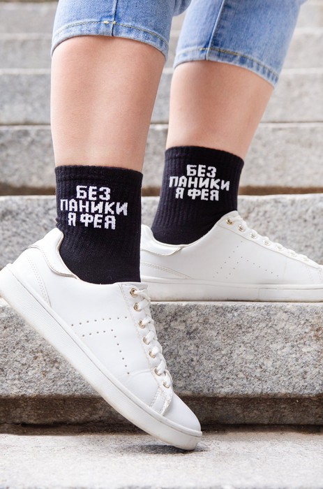 Черные женские носки выполнены из натурального хлопка и украшены прикольной надписью Без паники я фея.