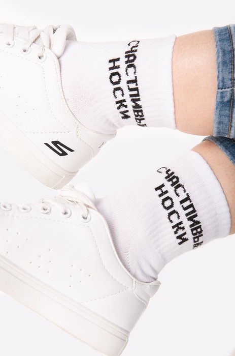Белые женские носки выполнены из натурального хлопка и украшены прикольной надписью Счастливые носки.