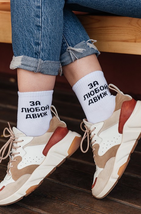 Белые носки с надписью За любой движ — стильная база, которая точно поднимет настроение! Носки отлично подходят женщинам, мужчинам и подросткам.