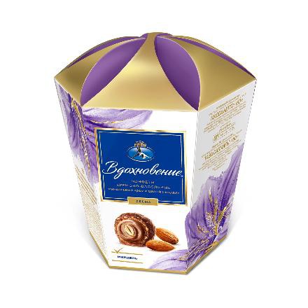 Конфеты «Вдохновение» с миндальным кремом и цельным миндалем – отличный подарок любителям изысканных сладостей. Ядрышко миндального ореха, укрытое нежным шоколадно-миндальным кремом, окутано хрупкой скорлупкой воздушной вафли. Каждый такой вафельный шар покрыт шоколадной глазурью, смешанной с дробленым орешком. Каждая конфета упакована в индивидуальный фантик, а изысканная шестигранная коробка придает набору торжественный подарочный вид.