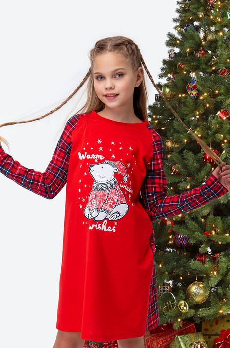 Детская новогодняя сорочка для девочки и девочки-подростка создана для уютного вечера на каникулах. Красная сорочка с длинными рукавами выполнена из натурального 100% хлопка. Ночная сорочка с принтом Мишка и с рисунком в клетку на рукавах и спинке — отличный подарок на Новый год и Рождество.