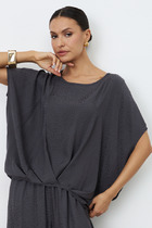 Платье отрезное по линии талии из эластичного полотна с жаккардовым анималистичным узором. Лиф, прилегающий с центральным швом на передней части и круглым вырезом горловины. Укороченный втачной рукав со сборкой по окату. Юбка летящего силуэта. На спинке платья выполнена застежка на молнию.