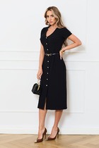 Платье полуприлегающего силуэта, расширенное книзу из эластичного полотна с жаккардовым узором. Боковые швы смещены в сторону переда. На передней части, ниже линии груди, выполнены рельефы. Линия рельефа начинается от выреза горловины и заканчивается в боковом шве на уровне выше линии талии. V- образный вырез горловины. Спинка со средним швом и талиевыми вытачками. Втачной длинный рукав.