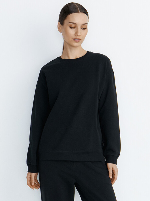 Женский свободный свитшот с длинным рукавом и круглым вырезом. Горловина обработана обтачкой из материала кашкорсе.