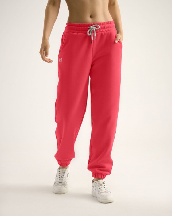 Джоггеры свободного кроя с боковыми карманами, собранные внизу. Широкий эластичный пояс со шнуром.