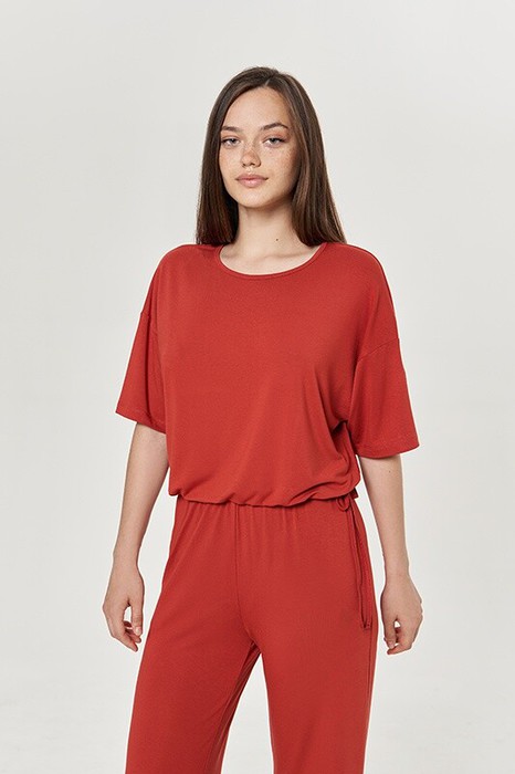 Футболка женская. Горловина окантована бейкой из основной ткани. Втачной рукав. По низу кулиска со шнурком. В левом боковом шве разрез