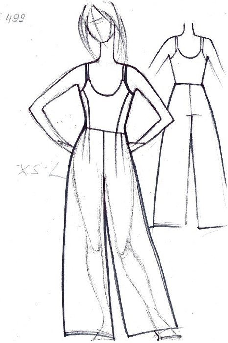 Комбинезон женский, с отрезной линией талии. Верх двойной на бретелях, прилегающий с рельефами по переду. Нижняя часть комбинезона расклешенная от линии бедер.