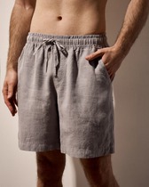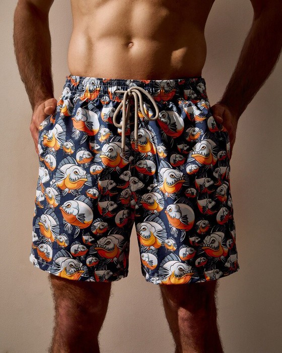 Плавательные шорты. Карманы в боковых швах. Задний карман с клапаном на правой задней половинке шорт. Пояс цельнокроенный, отстроченный, внутри с резинкой и шнурком.