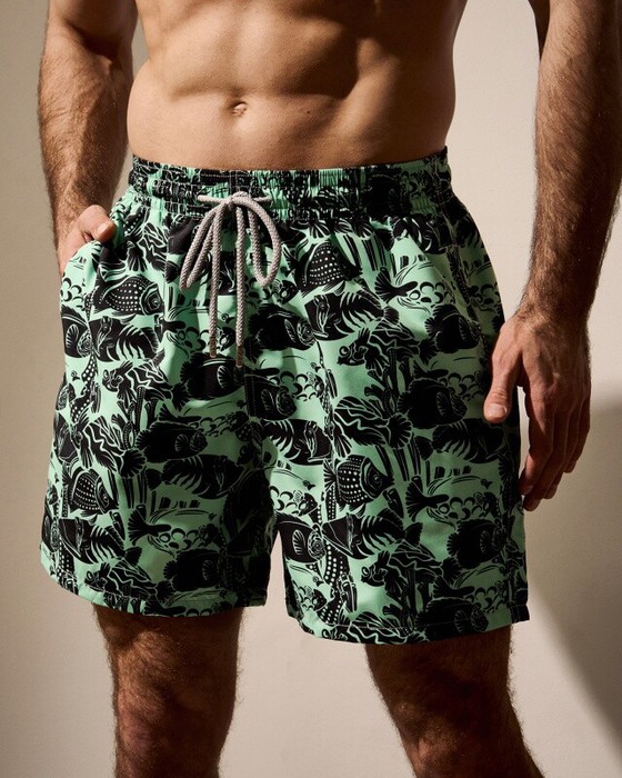 Плавательные шорты. Карманы в боковых швах. Задний карман с клапаном на правой задней половинке шорт. Пояс цельнокроенный, отстроченный, внутри с резинкой и шнурком.