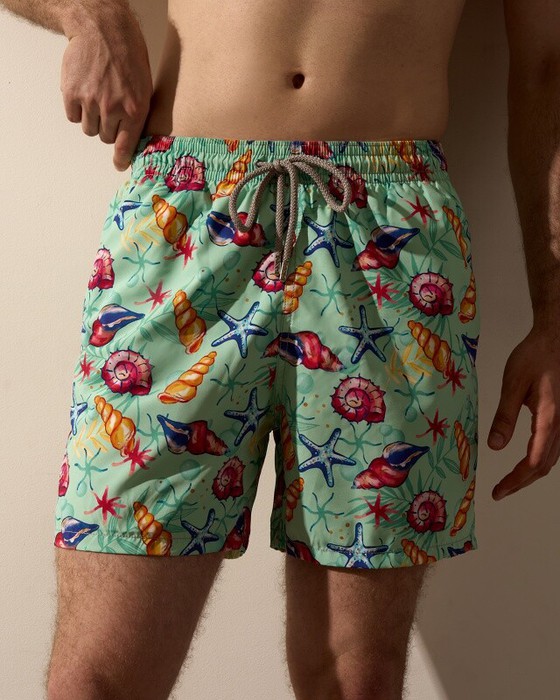 Плавательные шорты. Карманы в боковых швах. Задний карман с клапаном на правой задней половинке шорт. Пояс цельнокроенный, отстроченный, внутри с резинкой и шнурком.