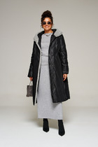 Утепленное стеганое пальто полуприлегающего силуэта-настоящий подарок для любителей классики. Изделие отрезное под линией груди с центральной застежкой на потайные кнопки. По низу рукава и по внутренней части воротника-стойки отделочная ткань светло-серого цвета. Низ рукава со шлицей на потайные кнопки. Утеплитель холкон (см.описание), плотность 100.