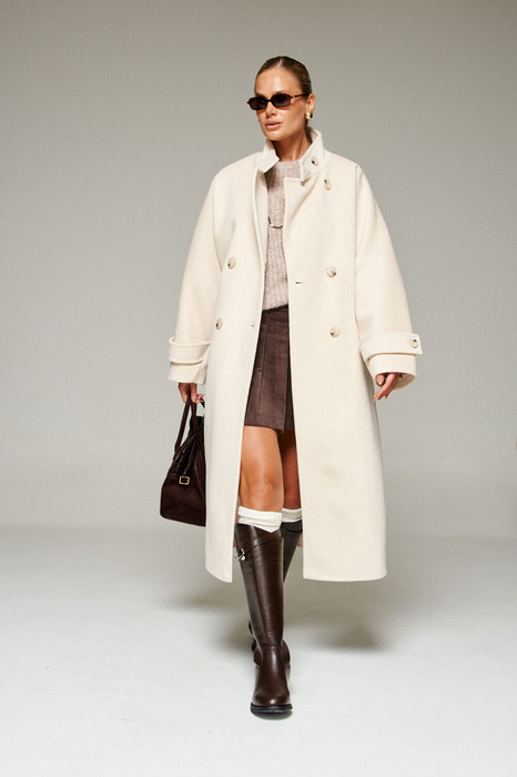 Пальто выполнено из шерстяной ткани, которая обеспечивает теплоизоляцию и защиту от ветра и влаги, подходит для межсезонья и теплой зимы. Двубортное, на подкладке.  Изделие рассчитано на температурный режим от +10 до -5 градусов. Модель прямого силуэта актуального покроя «летучая мышь»; предназначена для повседневного использования.