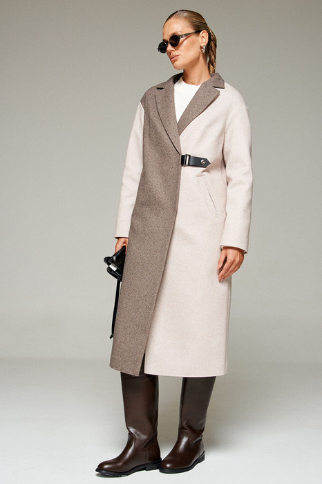 Пальто в актуальном сочетании меланжевых оттенков выполнено из шерстяной ткани, которая обеспечивает теплоизоляцию и защиту от ветра и влаги, подходит для межсезонья и теплой зимы. Двубортное, на подкладке.  Изделие рассчитано на температурный режим от +10 до -5 градусов. Модель прямого силуэта с удлиненной линией плеча, предназначена для повседневного использования.
