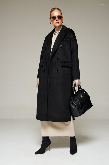 Пальто выполнено из шерстяной ткани, которая обеспечивает теплоизоляцию и защиту от ветра и влаги, подходит для межсезонья и теплой зимы. Двубортное, на подкладке.  Изделие рассчитано на температурный режим от +10 до -5 градусов. Модель прямого силуэта с удлиненной линией плеча, предназначена для повседневного использования.