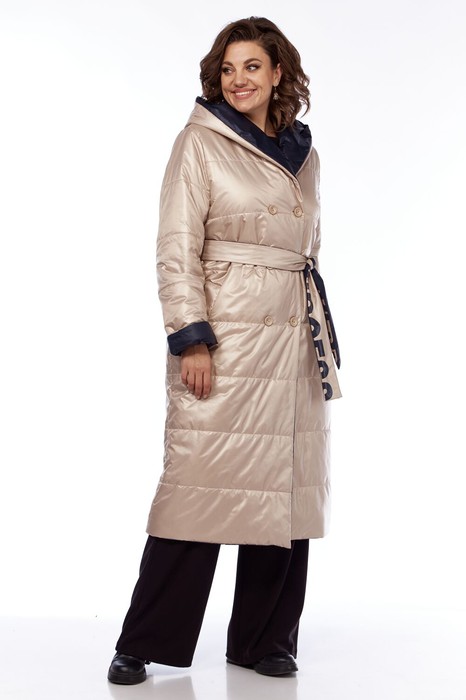 Пальто женское прямого силуэта с двубортной застежкой на 6 пуговиц. Пальто двухстороннее. Светлая сторона выстегана синтепоном. Перед с боковыми прорезными карманами с листочкой на светлой стороне и накладными на темной. Рукава втачной, двухшовный. Воротник-капюшон цельнокроеный с полочкой. Пояс съемный, двухсторонний, по светлой стороне украшен печатью.