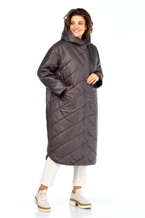 Пальто женское, прямого силуэта со смещенной застежкой на молнию (внутренняя) и кнопки. Линия плеча спущенная, рукав втачной одношовный. По переду карманы с личточкой. По спинке средний шов. Капюшон с центральной частью и отделочной деталью по отлету. В качестве отделки используется фурнитура и детали. Утеплитель- синтепон 150 гр.
