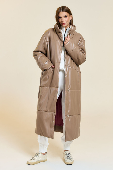 Пальто женское из экокожи с утеплителем ISOSOFT-100 подкладке. Перед и спинка с горизонтальными разрезами, имитирующими стежку. В один из подрезов на переде обработан карман, застегивающийся на потайную молнию. Рукав прямой одношовный с притачной широкой манжетой. Воротник- стойка. Застежка на пришивные кнопки.