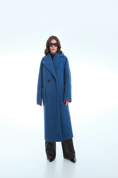 Пальто женское демисезонное, двубортное, прямого силуэта длинное. Застежка на петли и пуговицы. Перед с наклвдными карманами. Рукава комбинированные с ластовицей, длинные двухшовные с притачной нижней частью. Воротник и лацкана отложные. Пальто из пальтовой ткани, на подкладке. По воротнику, лацканам, бортам, среднему шву спинки, краю кармана широкая отделочная строчка