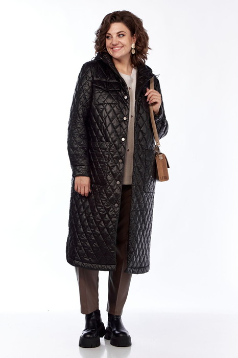 Пальто женское свободного силуэта изготовлено из стеганной курточной ткани на синтепоне. Горловина оформлена капюшоном на стойке, с кулисой и втянутым шнуром с фиксатором. По переду обработаны нагрудные вытачки, верхние накладные карманы с клапаном и нижние накладные карманы. Спинка цельнокроеная. Рукава втачные двухшовные по низу рукава обработаны манжеты с застежкой на кнопки. Низ в изделии фигурный. Сезон — морозная осень, температурный режим до -5С.