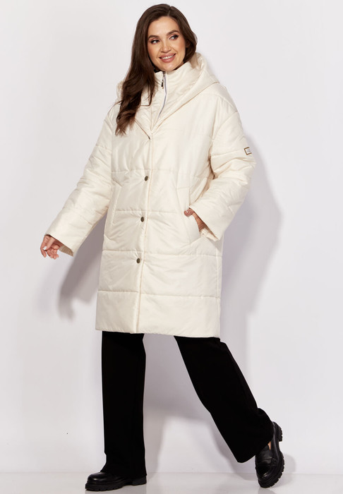 Пальто женское, прямого силуэта, с длинным рукавом. Длину рукава можно регулировать отложной манжетой. На левом рукаве отделочная нашивка. Рукав со спущенной линией плеча. По переду карманы "листочки" Горловина оформлена капюшоном, с отрезными бортами. Застежка центральная , однобортная, на кнопки. По переду, втачная деталь с воротником стойка, имитация жилетки, с застежкой на тесьму "молния" Спинка без особенностей. Пальто на подкладке. Синтепон VS-200.