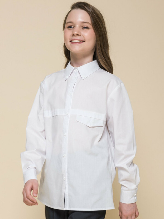 Школьная блузка прямого силуэта для девочки. Преобладающий в составе ткани хлопок делает эту модель мягкой, дышащей и комфортной для ребёнка. Благодаря полиэстеру изделие сохраняет форму и превосходный внешний вид. На спинке кокетка с защипом - свобода движения, комфорт в течение дня. По переду под кокеткой имитация кармана в виде декоративного клапана – актуально и стильно. Воротник украшают декоративные пуговицы — оригинально. Практичная и универсальная модель благодаря лаконичному дизайну великолепно сочетается с различными брюками и юбками. Отличный вариант детской блузки для школы.