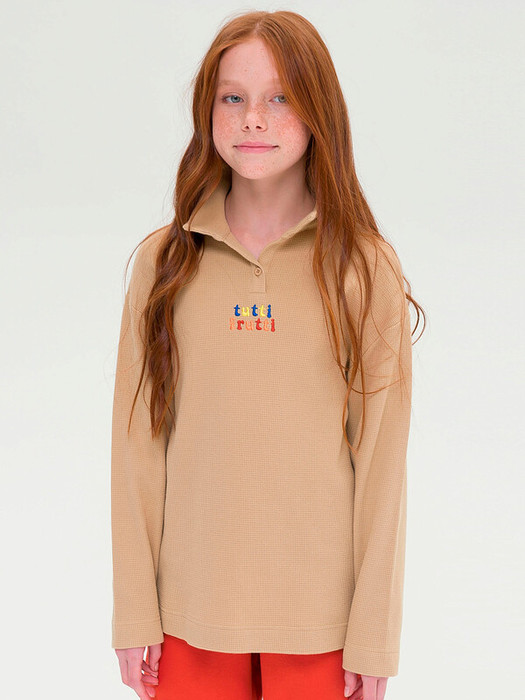 Лонгслив-поло для девочек. Приятный на ощупь, с большим содержанием хлопка в составе, гигроскопичный и простой в уходе вафельный трикотаж. Свободный силуэт со спущенным плечом для комфорта движений. Воротник сделан из основной ткани, планка у горловины на пуговице. Цветная вышивка спереди – фишка модели. Широкая подгибка рукавов и низа – актуальный тренд на увеличенные отделочные детали кроя. Лонгслив подходит на каждый день, для активного образа жизни, идеален для пляжного сезона.