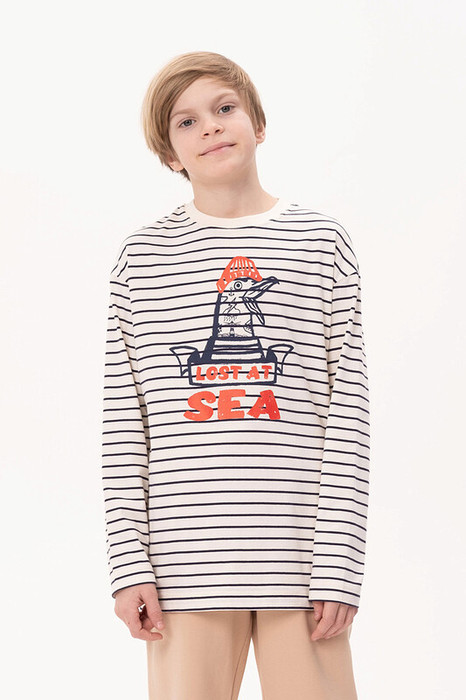 Лонгслив для мальчика с принтом. Тельняшка свободного силуэта со спущенным плечом. Футболка в полоску с длинным рукавом выполнена в морском стиле.  Горловина обработана эластичной рибаной - голова не застрянет. Изделие украшено ярким принтом с надписью. Перевод надписи "lost in the sea" - затерянный в море. Комфортная спортивная кофта подойдет в качестве полезного подарка сыну, племяннику, подросткам на любой праздник: 23 февраля, 9 мая.Тонкая кофта подойдет и малышам для детского сада. Джемпер можно носить круглогодично. Помните о правильном уходе за изделием: рекомендуется стирать при температуре не выше 30 °C, без предварительного замачивания, с изнанки. Это поможет сохранить качество и цвет лонгслива на длительное время.