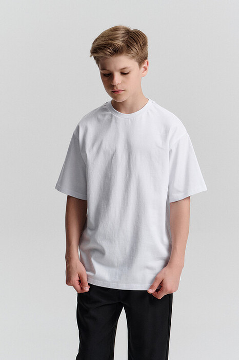 Эта белая футболка — настоящая классика, которая всегда будет в моде и нужна в гардеробе каждого мальчика. Умеренный объём делает её удобной и комфортной — она не слишком тесная и не слишком свободная, идеально подходит для школы и активного дня.