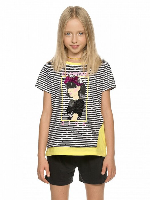Комплект для девочек футболка и шорты из 100% хлопка. Футболка умеренного объема с мягкой линией плеча. Имитация многослойности - одна футболка, надетая поверх другой. Верхняя полосатая, с ассиметрично срезанным боковым швом и горловиной из рибаны в цвет нижней. Нижняя желтая. Принт с замаскированными в полоски мордочками кота. По центру вышивка из переворачивающихся пайеток и неоновый принт с глиттером, перевод Гламурная дива. Футболка с актуальными трендами сезона для самых продвинутых девчонок.   Шорты умеренного объёма с защипами у пояса. Регулировка объема внутренним шнуром. Комплект можно носить по отдельности и это делает его универсальным.