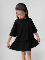 Комплект для девочек футболка и юбка. Футболка свободного объёма с цельнокроеным рукавом с отгибающейся закрепленной манжетой. Вдоль линии плеч настрочена декоративная трикотажная тесьма. По переду изделия принт с разноцветным глиттером в виде птичек колибри и надписи, перевод Блестящее будущее , и вышивка из переливающихся переворачивающихся пайеток. Юбка - Новинка. Прямоугольная юбка с фигурной угловатой линией низа, пояс на широкой внутренней резинке.