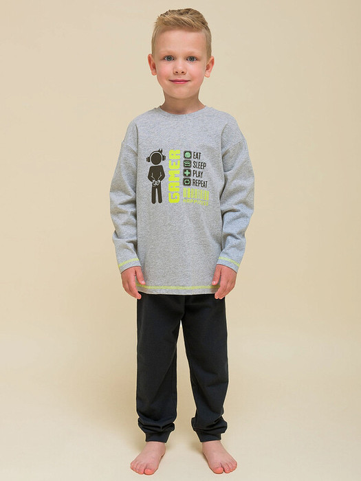 Уютная пижама для мальчика. Изделие выполнено из 100% хлопка — идеальный вариант для детской пижамы. Ткань из хлопка приятна на ощупь и превосходно пропускает воздух, позволяя коже ребёнка дышать. В пижаме из хлопка ребёнку будет комфортно, даже если он сбросит одеяло. Джемпер и брюки умеренного объёма, рукава свободные — пижама очень удобна для сна. В поясе брюк мягкая и широкая резинка — не перекручивается и не давит. Манжеты брюк и отделка горловины джемпера из эластичной рибаны — комплект удобно надевать и снимать. А также резинка отлично сохраняет форму в течение долгого времени. Брюки выполнены в практичном чёрном цвете и лаконичном дизайне. Джемпер актуального оттенка "серый меланж" украшен контрастными строчками по низу и рукавам — один из модных трендов. По переду забавный принт геймерской тематики — порадует любого мальчишку! Перевод: "Есть, спать, играть, повторять. Счастье". Принт мягкий и эластичный, отлично переносит многочисленные стирки. Комплект подходит для сна как дома, так и в детском саду