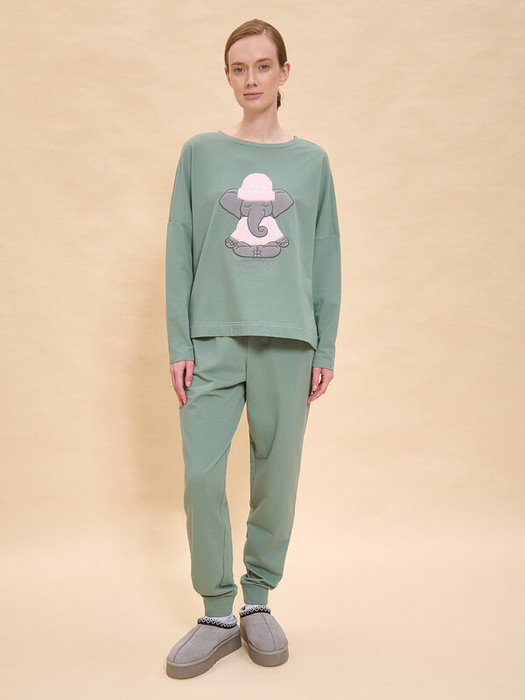Теплая пижама женская. В составе ткани (футер с начёсом) преобладает высококачественный хлопок — комплект для сна мягкий, гипоаллергенный и хорошо пропускает воздух. В хлопковой пижаме вам будет тепло и уютно во время сна. Эластан помогает модели надолго сохранить первоначальную форму. Джемпер и брюки умеренного объёма, плечо джемпера спущено, спинка чуть длиннее переда— в пижаме очень удобно спать. В поясе брюк мягкая и широкая резинка — не перекручивается и не давит. Отделка горловины из эластичной рибаны — она не растягивается, пижаму удобно надевать и снимать. Хлопковая пижама украшена милым, «няшным» принтом в виде медитирующего слоника, надписи переводятся: «никакой спешки», «не беспокойтесь» — почувствуйте себя уютно и беззаботно. Шляпка и майка слоника — аппликация из тактильного приятного бербер-флиса с нежной фактурой барашка. Пижамный костюм неприхотлив в уходе. Принт эластичный и мягкий, хорошо переносит частые стирки. Пижама женская с брюками подходит как для сна, так и просто для отдыха дома. Помните о правильном уходе за изделием: рекомендуется стирать при температуре не выше 30 °C, без предварительного замачивания, с изнанки. Это поможет сохранить качество и цвет пижамы на длительное время.