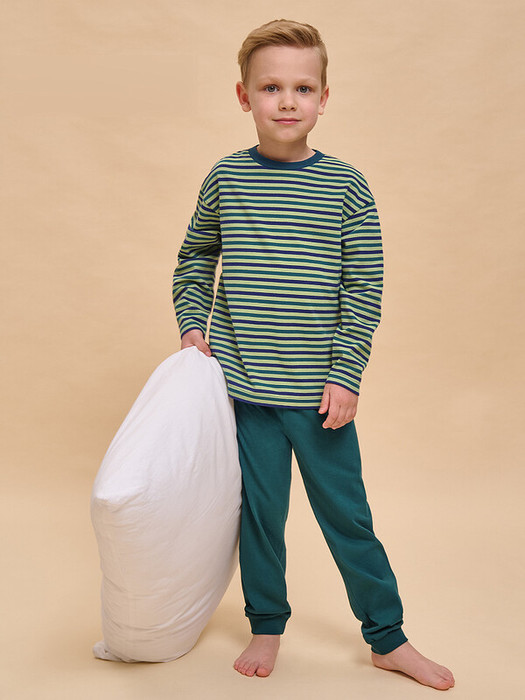 Пижама детская для мальчика. Натуральный состав ткани (100% хлопка) обеспечивает изделию мягкость, гипоаллергенность и воздухопроницаемость. Благодаря этому сон комфортный и качественный. В пижаме из хлопка ребёнку будет тепло, даже если он сбросит одеяло. Джемпер и брюки умеренного объёма, рукава широкие и свободные — комплект для сна очень удобен. В поясе и по низу брюк мягкая и широкая резинка — не перекручивается и не давит. Отделка горловины джемпера из эластичной рибаны — ребёнку удобно надевать и снимать пижаму. А также рибана сохраняет отличную форму надолго. Хлопковая пижама лаконичного дизайна: брюки однотонные, джемпер в узкую горизонтальную полоску. Детская пижама для мальчика неприхотлива в уходе, без проблем переносит частые стирки. Детская пижама с брюками подходит для сна как дома, так и в детском саду — отличный выбор для вашего ребёнка! Помните о правильном уходе за изделием: рекомендуется стирать при температуре не выше 30 °C, без предварительного замачивания, с изнанки. Это поможет сохранить качество и цвет пижамы на длительное время.