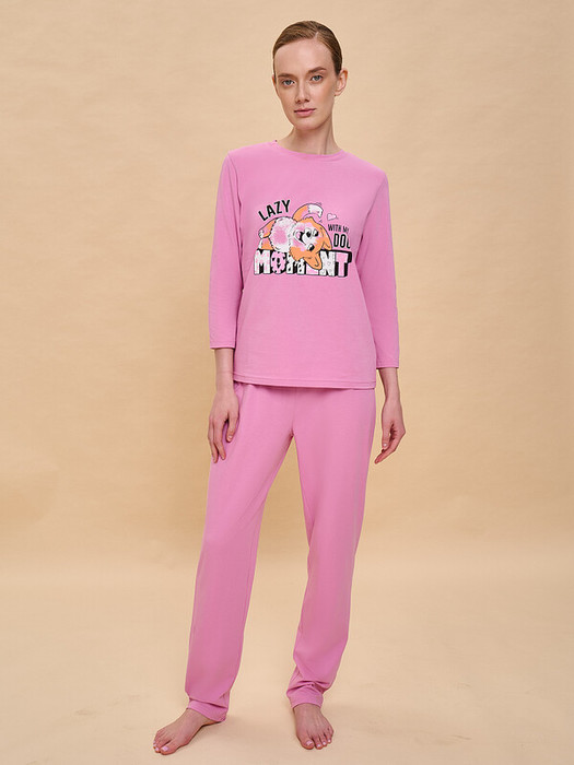 Костюм пижамный женский. В составе ткани преобладает высококачественный хлопок — комплект для сна мягкий, гипоаллергенный и воздухопроницаемый. В хлопковой пижаме вам будет тепло и уютно во время сна. Эластан помогает модели надолго сохранить первоначальную форму. Джемпер и брюки умеренного объёма, плечо немного спущено, рукава широкие и свободные — в пижаме очень удобно спать. В поясе брюк мягкая и широкая резинка — не перекручивается и не давит. Отделка горловины из эластичной рибаны — она не растягивается, пижаму удобно надевать и снимать. Хлопковая пижама украшена милым, «няшным» принтом в виде собачки корги, надпись переводится: «ленивый момент с моей собакой». Пижамный костюм неприхотлив в уходе. Принт эластичный и стойкий, хорошо переносят частые стирки. Пижама женская с брюками подходит как для сна, так и просто для отдыха дома, пижамной вечеринки. Помните о правильном уходе за изделием: рекомендуется стирать при температуре не выше 30 °C, без предварительного замачивания, с изнанки. Это поможет сохранить качество и цвет пижамы на длительное время.