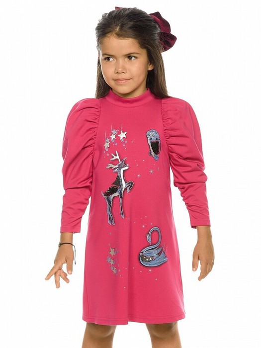 Нарядное платье, слегка расширенное к низу. Горловину украшает изящная стойка, застёжка на две пуговицы по спинке. Фишка платья в пышных рукавах, объём которых достигнут за счет густой сборки оката. Сборка рукава по внутреннему шву на эластик позволяет регулировать длину. Перед декорирован сказочным принтом с серебряным металликом и пайетками.