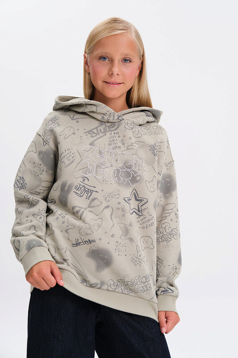 Модное худи для девочки из тонкого футера с мягким начесом — лёгкое и тёплое, идеально для прохладных дней. Модель умеренного объёма удобно сидит и не сковывает движений.