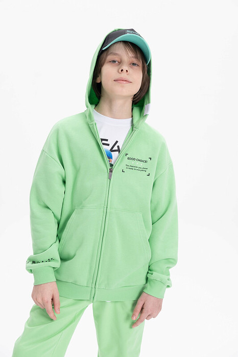Трикотажный бомбер для мальчика. Модель выполнена из плотного футера-петля. Изделие прямого силуэта, объем оверсайз. Манжеты рукавов и низ толстовки выполнены и рибаны. По переду накладные карманы. На спине принт с надписью. Перевод надписи: "easy" - легко. Спереди высокий резиновый текстовый принт и нашивка. Перевод надписей "Good choice! The character you chose is ready to everything" - хороший выбор! Выбранный персонаж готов ко всему. Рукава тоже декорированы принтом с надписью "digital" - диджитал. На капюшоне предусмотрена регулировка объема утяжкой. Зипка застегивается на молнию. Кофта спортивная имеет широкий размерный ряд, который подойдет как малышам так и подросткам. Подходит для круглогодичного ношения весной, летом, осенью и зимой.